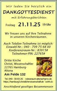 Wir laden Sie herzlich ein, unsere Gottesdienste und den Leseraum zu besuchen.